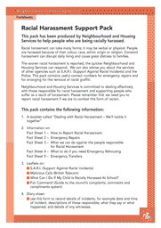 ![]() | An example of a support pack for victims of racial harassment, developed by Bristol council, can also be downloaded here Some further information is available on Bristol City Council's website |